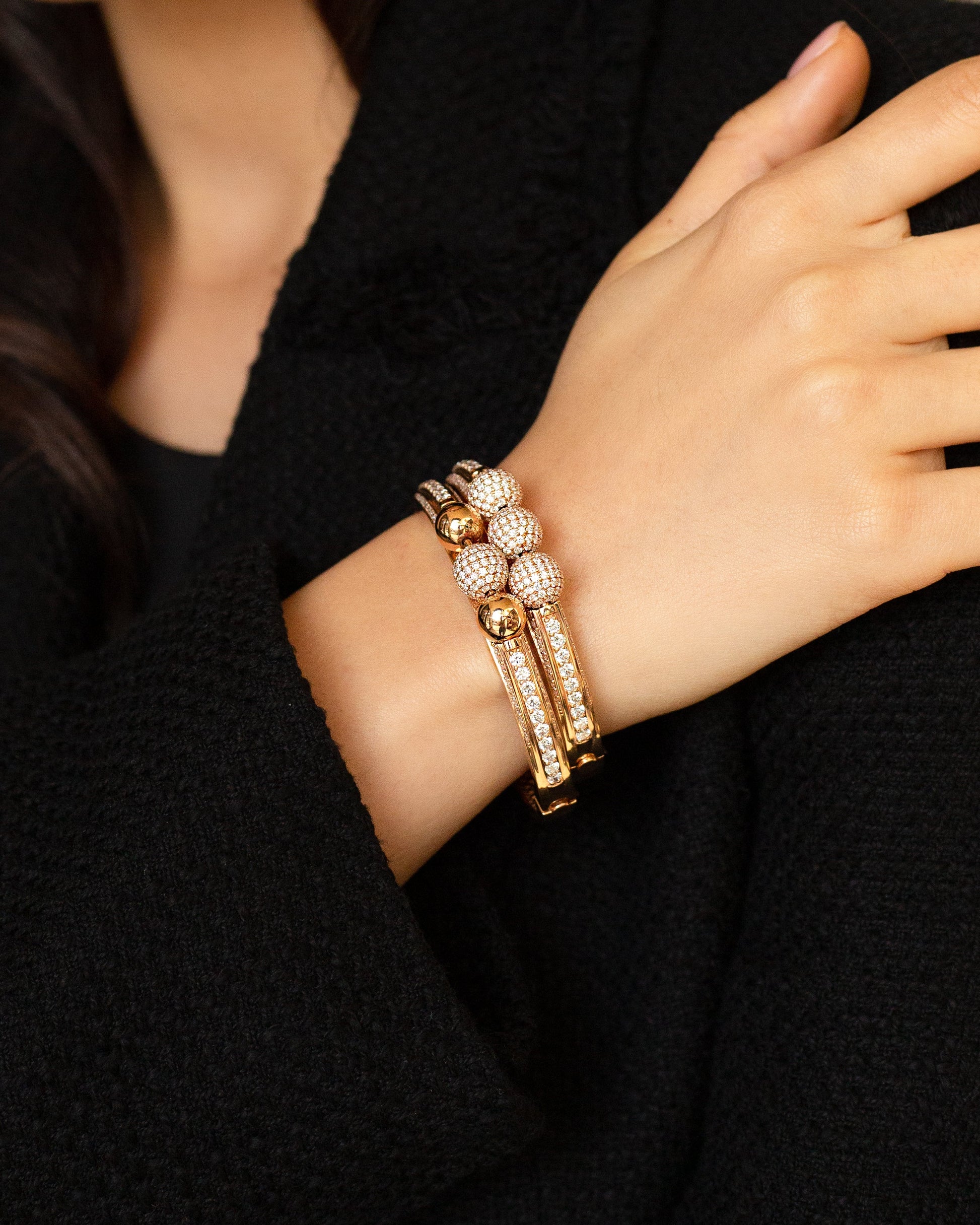 The uniqueness of the Ethos bracelet lies in its interchangeable spheres, which enable the wearer to switch styles effortlessly by collecting different spheres and swapping them as desired.