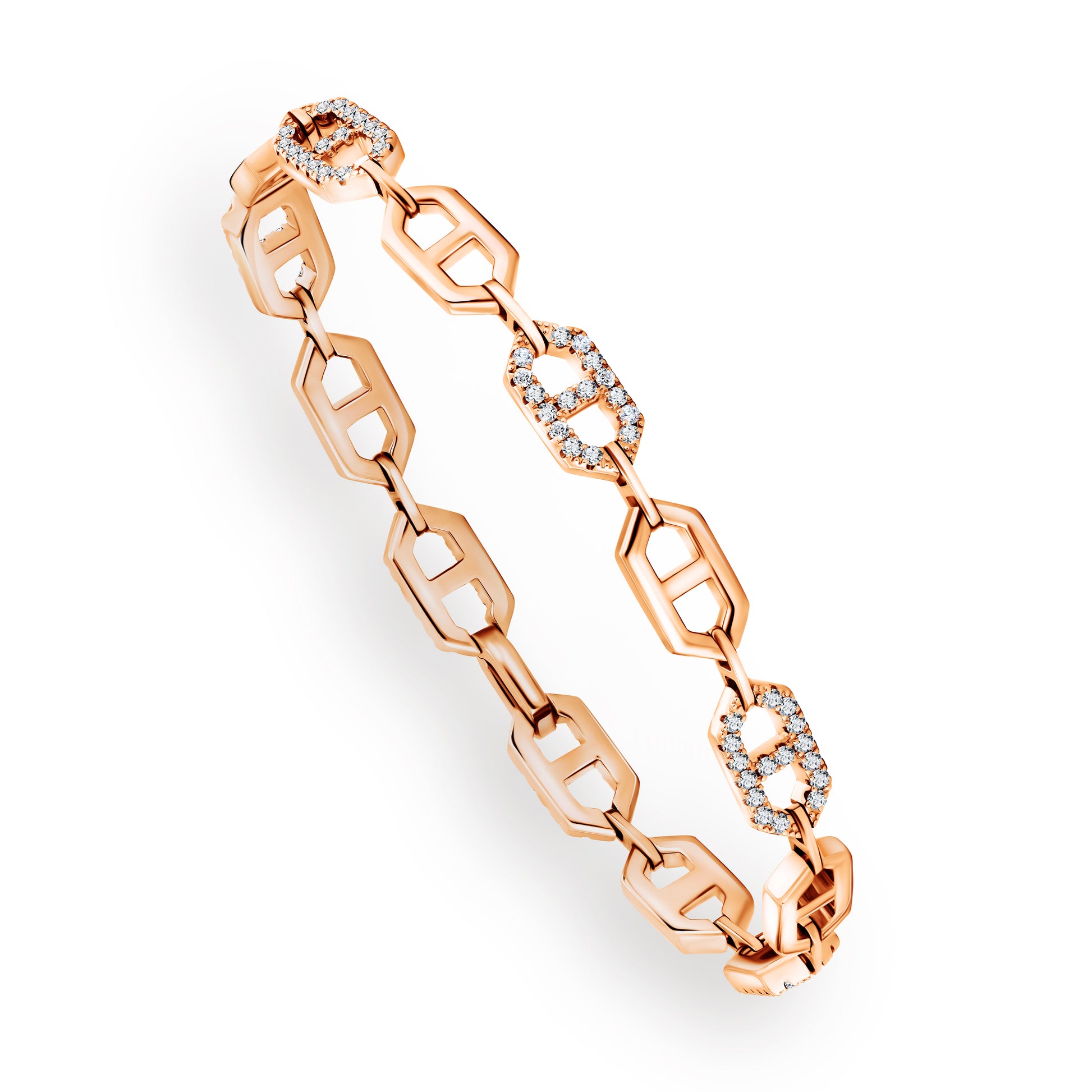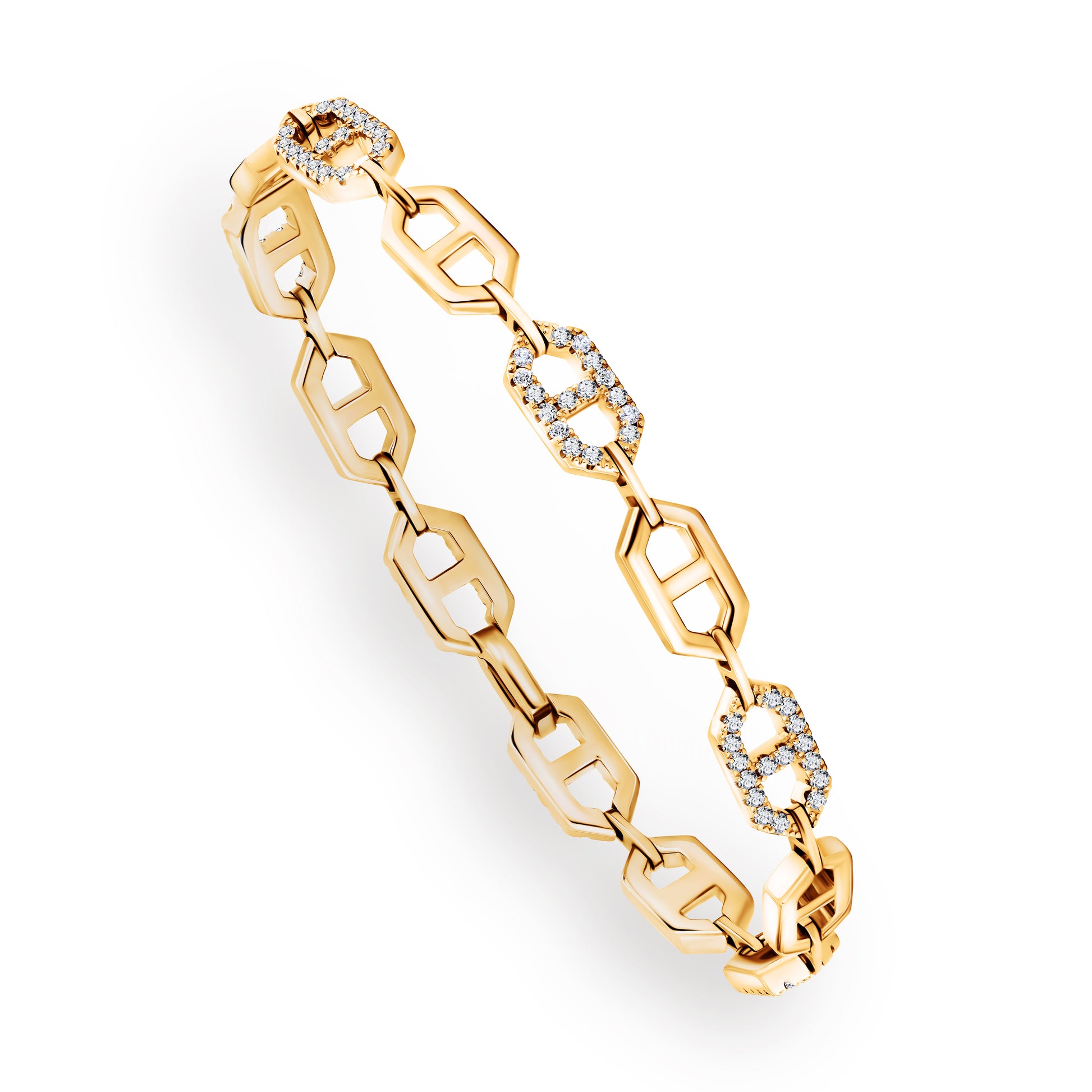 The Hexpression Bracelet™ with flexible hexagonal links in 18k gold pave set with fine white diamonds on every other link.